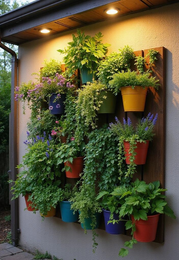 For added flair, incorporate lighting that highlights your vertical garden, such as small spotlights or string lights, to make it a breathtaking feature at night.