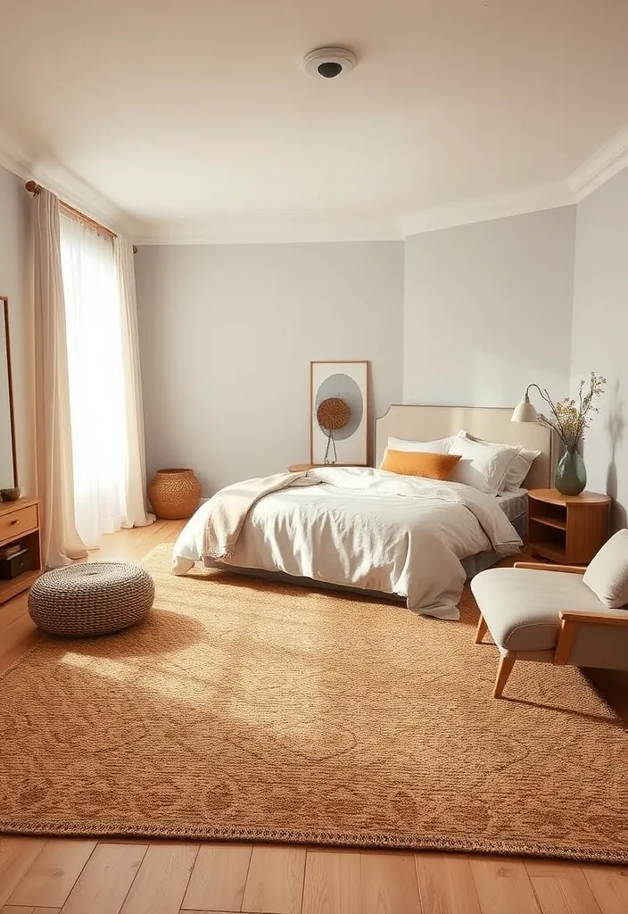 A soft area rug can add warmth and comfort to your Japandi bedroom, enhancing the serene atmosphere. Choose rugs made from natural fibers such as wool or jute that feel cozy underfoot.