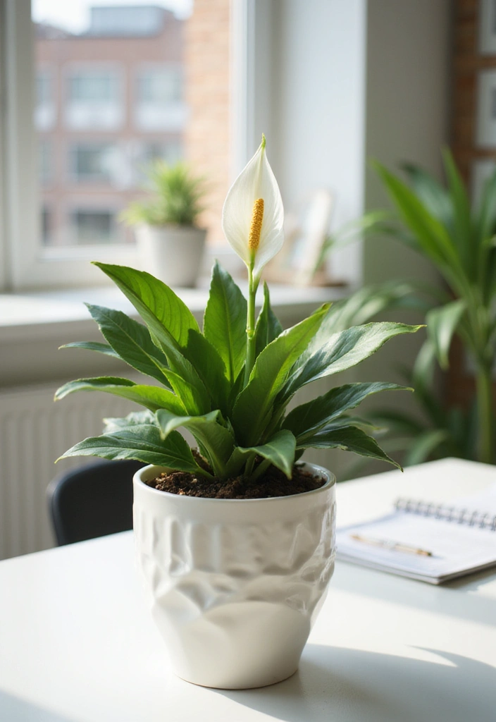 Bring elegance to your workspace with a peace lily (Spathiphyllum).