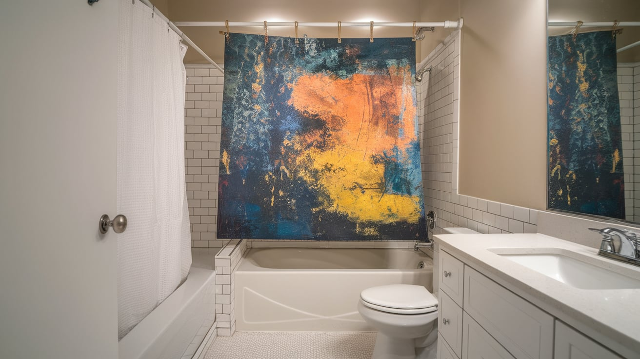 Imagine a simple white bathroom with a splashy piece featuring cobalt blue and gold—suddenly, it’s not just a bathroom, it’s a conversation starter. Abstract art allows you to pull accent colors into your towels and accessories, making the whole space feel intentional.