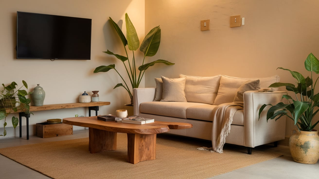Pick one accent color—like dusty blue, sage green, or terracotta—and carry it through cushions, throws, or wall art. This subtle coordination makes the lounge area feel intentional, not random.