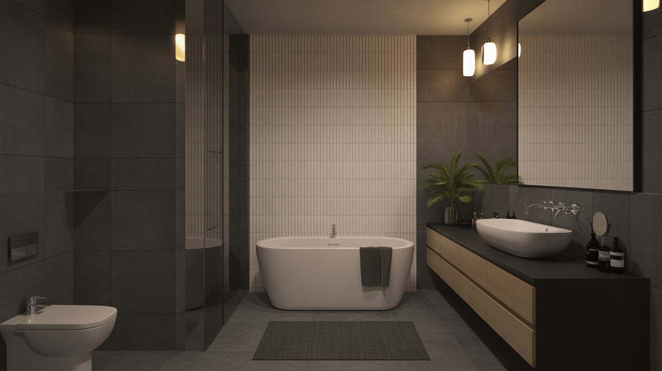 For example, black tiles in the shower, a dark gray vanity, and a lighter slate floor. The variation keeps the room dynamic without losing its modern edge.