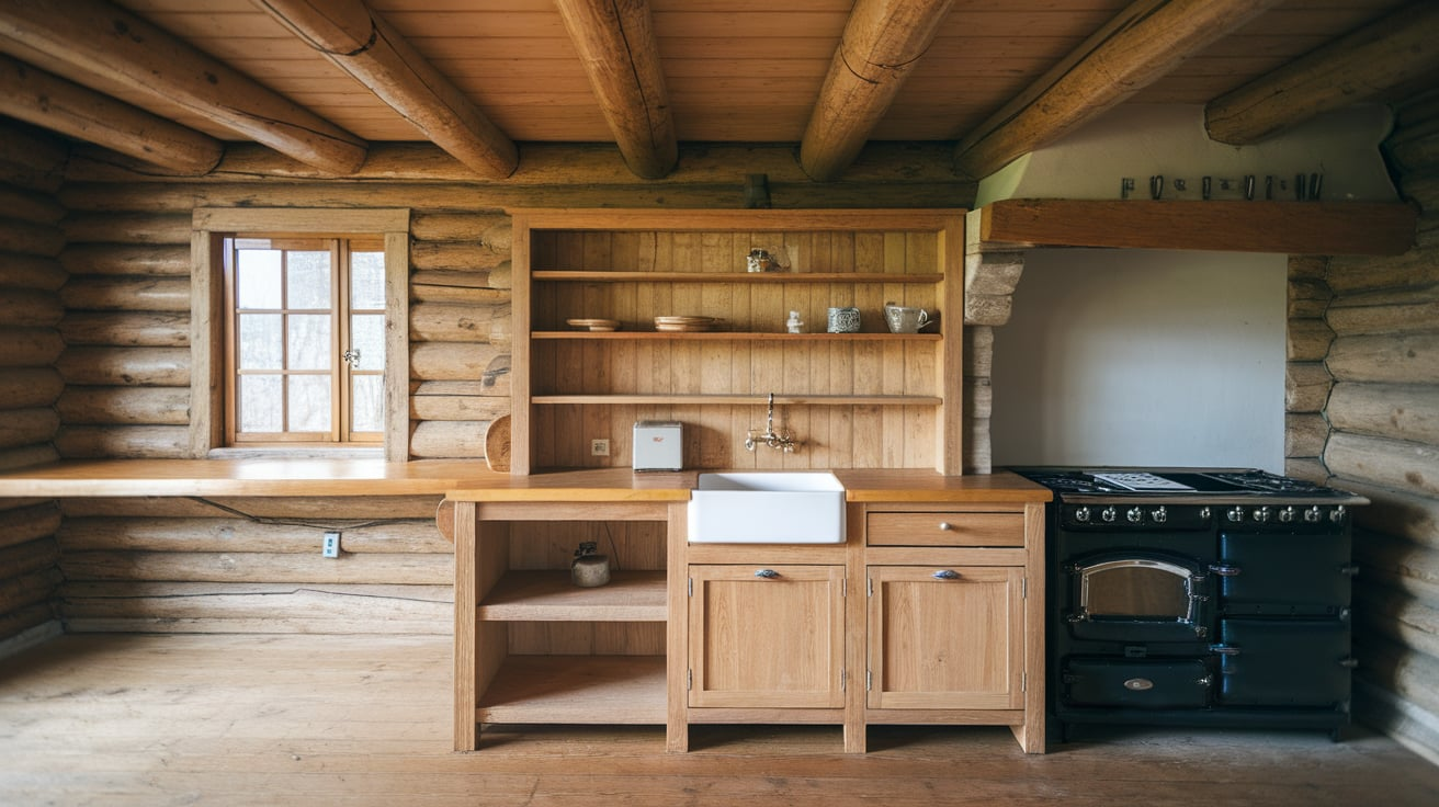 Rustic doesn’t have to mean cluttered. Scandinavian rustic kitchens use light wood, clean lines, and minimal décor. This style makes smaller log kitchens feel larger and more breathable.