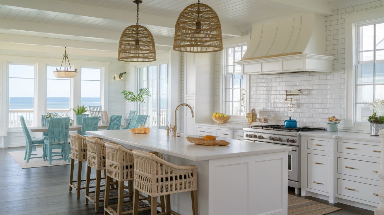 Think rattan, bamboo, wicker, and reclaimed wood. These materials give your kitchen a natural, textured look. Even small accents, like a bamboo utensil holder or a wicker bread basket, can transport you to a beachside cottage.