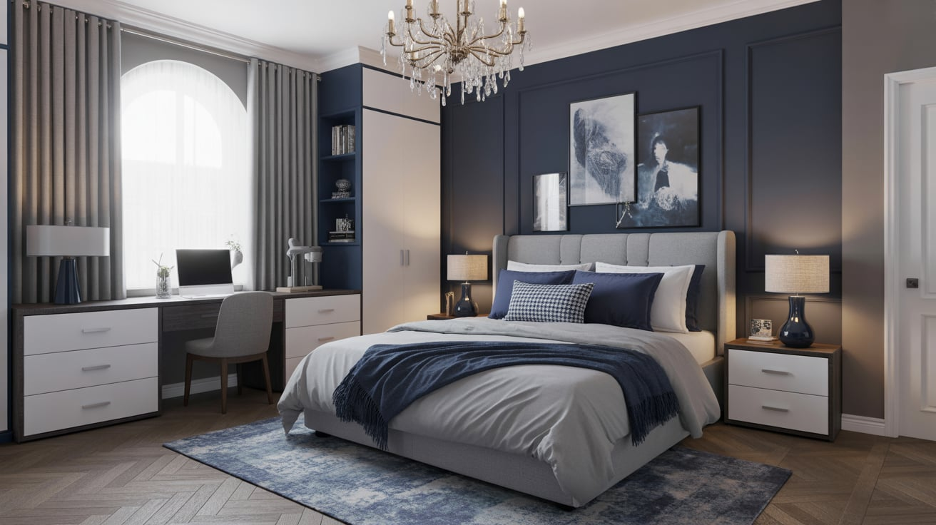 Wallpaper adds texture and depth. A grey wallpaper with subtle patterns (like linen weave or geometric designs) paired with navy bedding looks far more sophisticated than plain paint.
