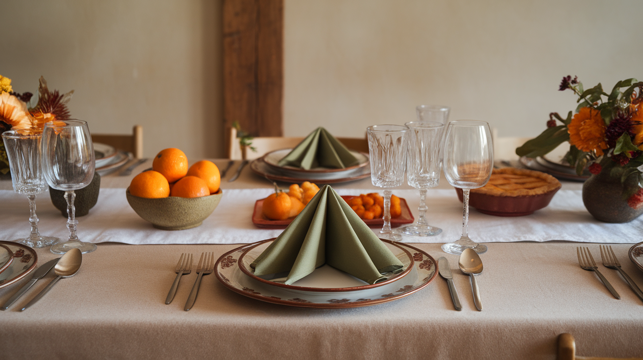 Bringing the outside in never fails. Use fresh greenery garlands (like eucalyptus, olive branches, or magnolia leaves) down the center of the table. Scatter pinecones, acorns, or tiny pumpkins between them.