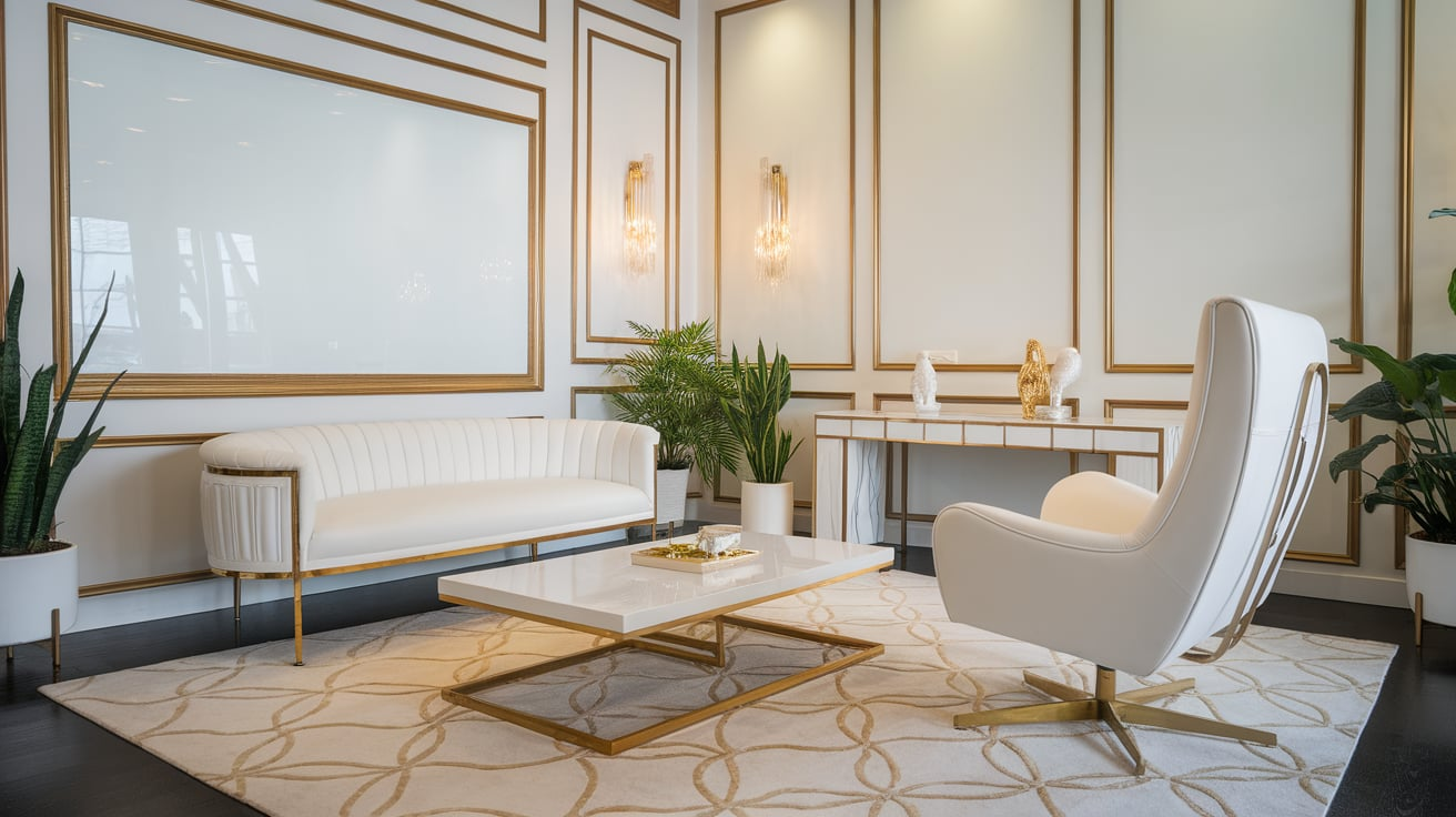 If you have space, add a small white sofa with a gold base. It turns your office into a multifunctional lounge space for reading or brainstorming. Guests will feel the luxury immediately.