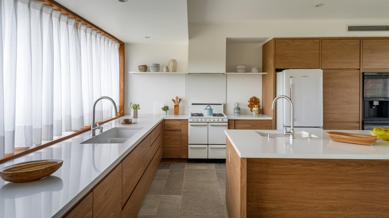 8. White Countertops with Warm Wood Accents